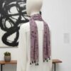 A soft dusty-rose chiffon scarf adorned with midnight (black) floral accents and tassel details for timeless elegance.