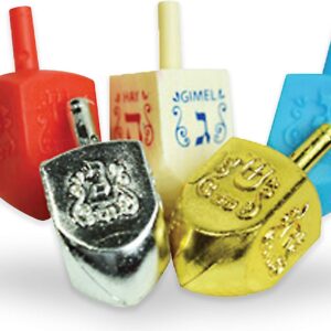 DREIDELS: Variety of medium plastic Draidel – wooden – gold – metallic – plastic.